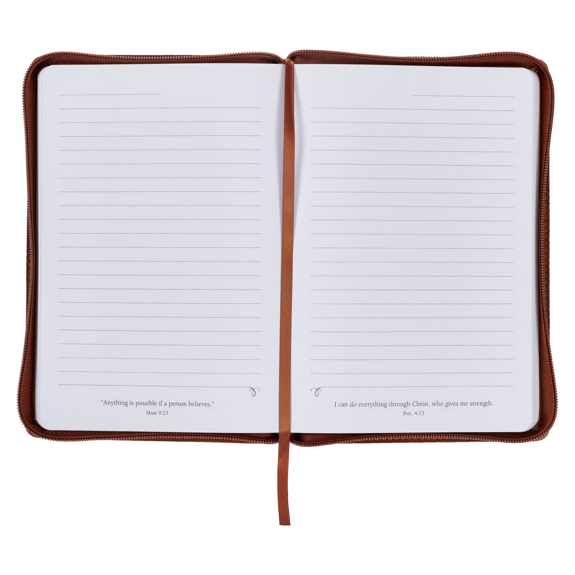 This inspirational journal's matching brown zipper enclosure secures the contents to prevent any loss of loose pages or notes. Stay organized and effortlessly hold your place with its brown satin ribbon page marker. As you write, find additional encouragement in the Scripture verses at the bottom of each page. For a personal touch, utilize the presentation page at the front of the journal to customize it as a heartfelt gift for a relative, friend, or coworker.