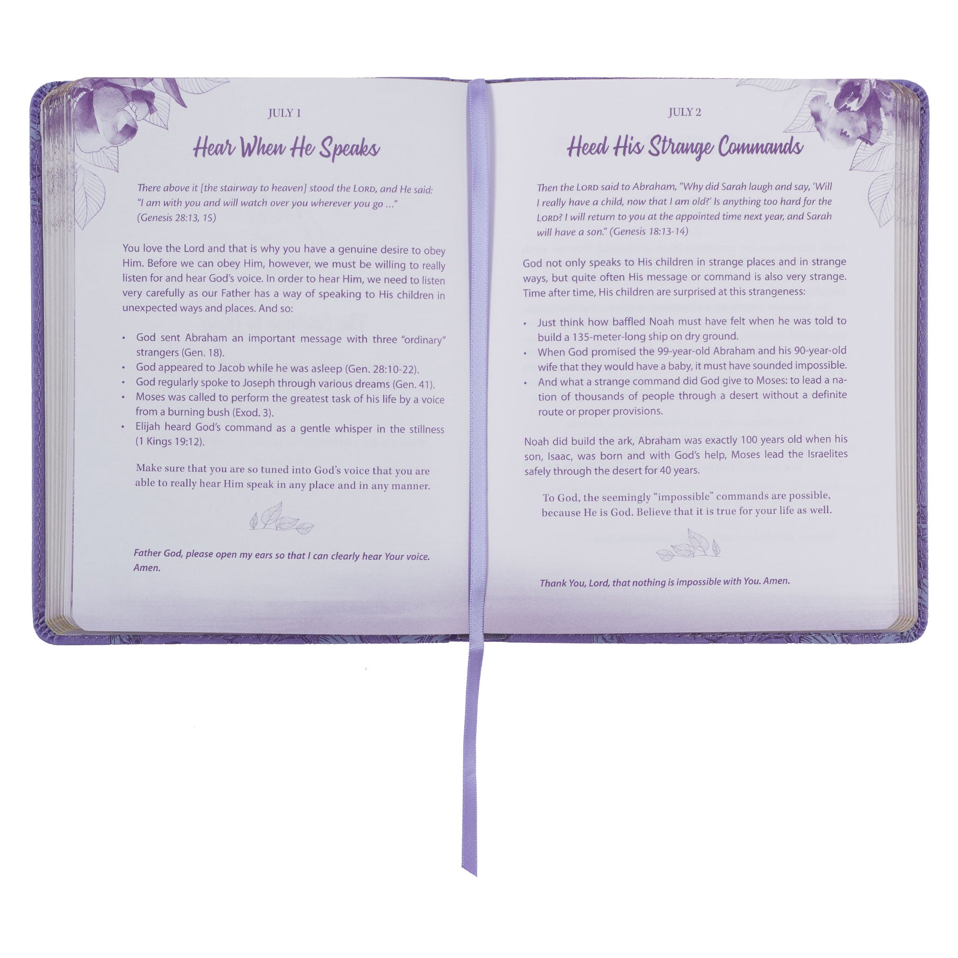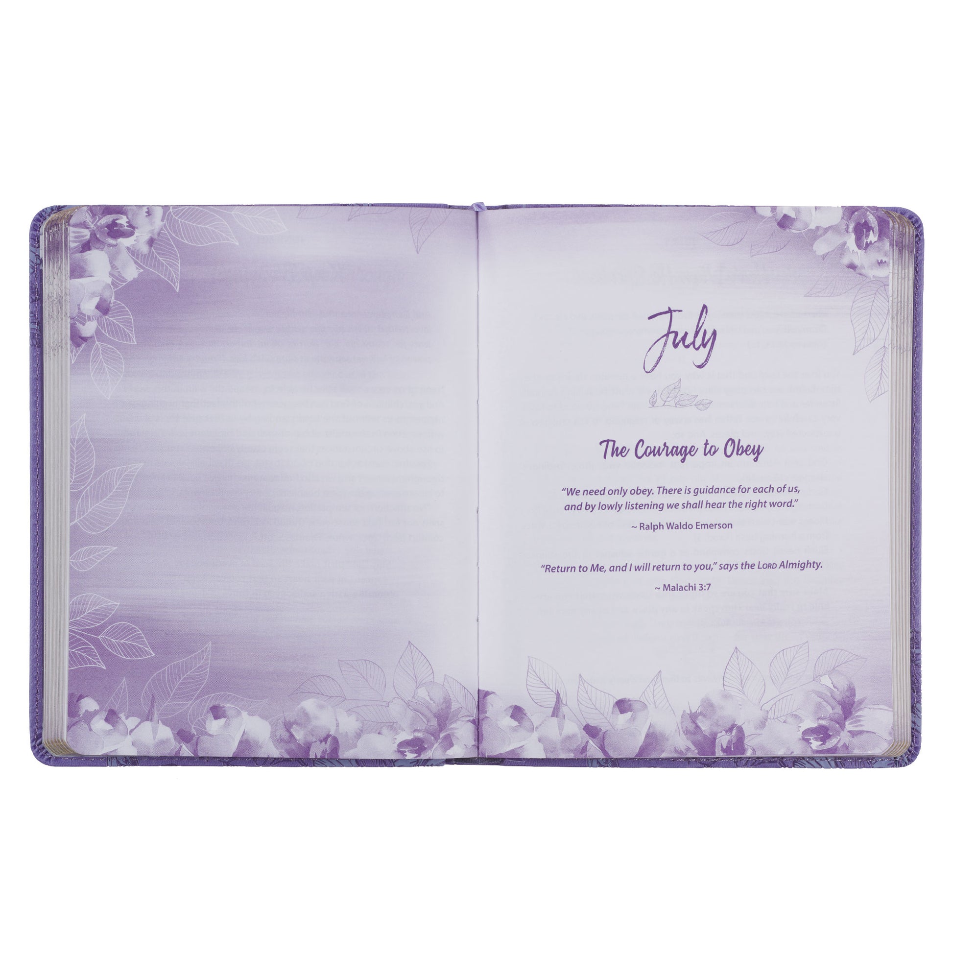 The Strong and Courageous Purple Faux Leather Devotional is the perfect companion to help you face life's struggles with bravery and confidence. With 366 daily devotions, this devotional will help you experience God's peace, love, and presence in a tangible way, reminding you of His unwavering faithfulness throughout the year.
