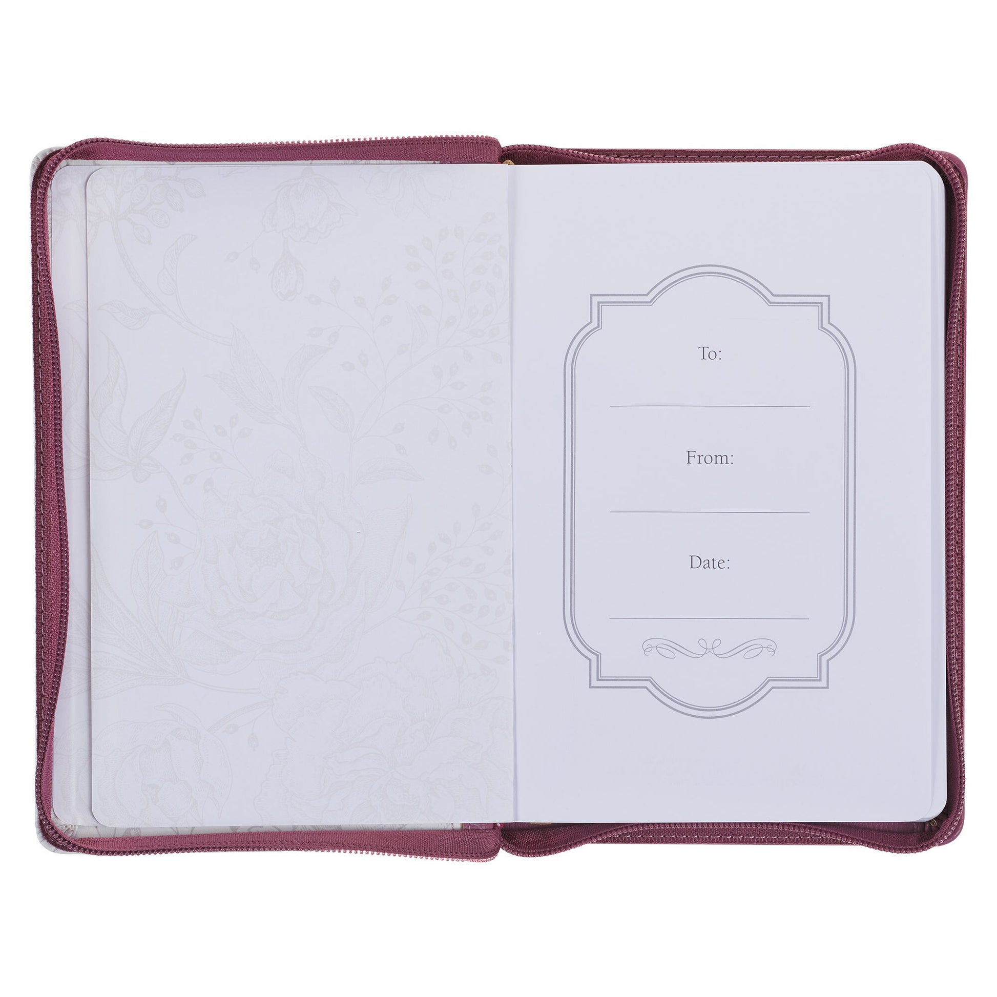 This journal's 366 lined pages have carefully selected Bible verses printed at their base. A small dotted line in each top right corner is included for recording dates or titles. The first page is a presentation page that provides space to write a note to the person receiving this journal if it is given as a gift.