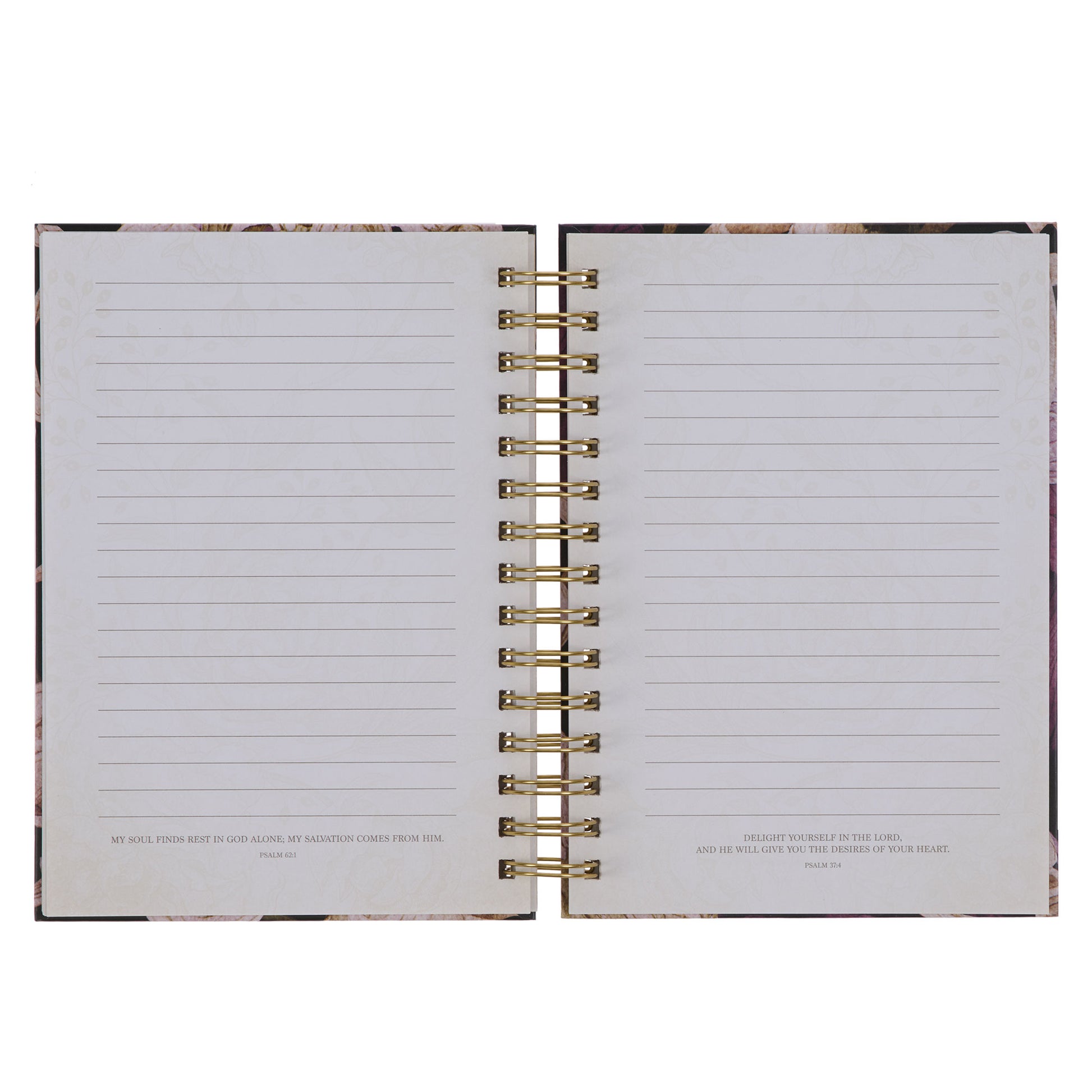 Gossamer pink and ivory irises emerge gracefully from the deep, shadowy black background on the wirebound journal's front cover. A thin gold-foiled border with gold-foiled corner scroll designs frames both the design and the sentiment, which is printed in white letters outlined in gold foil. Additional gold-foiled flourishes and letters beautify the design.