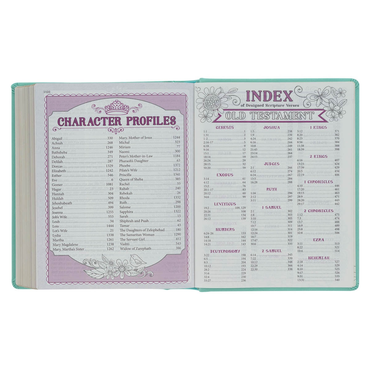 The Bible features two content lists: one lists the books of the Bible in chronological order, and the second lists the books alphabetically. A Bible Memory section includes 66 well-loved Bible verses that every Believer should know and 12 line drawing prayers that will help young girls learn to pray about everything, are ready to be colored and memorized. A line drawing illustration introduces each book of the Bible, and the content that follows is accented with pink banners and highlighted text. 366 devotions set in the margins offer inspiring messages to help girls apply biblical truth to their lives. Inspirational stories of 50 memorable women characters in the Bible will motivate girls to pursue a life of faithfully following God.