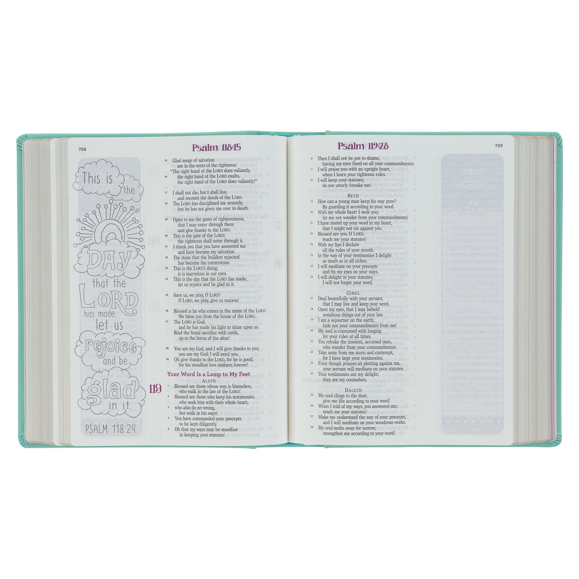 The full ESV text is included in the Teal Butterfly Hardcover My Creative Bible for Girls. The fun starts right away with illustrated end pages just waiting to be colored. The presentation page allows you to add color and a name or message when it is given as a gift. The text is organized in a single-column format and flanked by two-inch-wide margins filled with fun and inspiring line drawings, lined space to record notes, and illustrated devotional panels. You can even use these margins to create your own doodles.