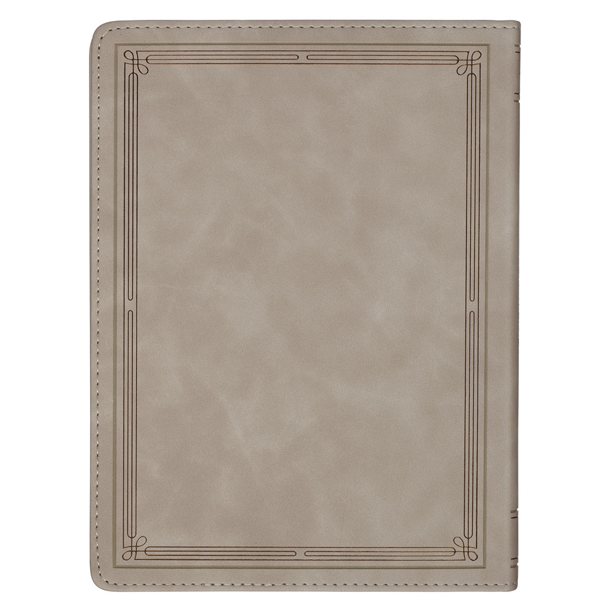 The devotional's rich taupe faux leather cover has a distinctive minimalistic feel with its elegant and simple design. A heat-debossed frame with a greige shadow frame that sports corner scroll designs is the main decoration on the cover. In the middle of the frame, the title and author's name are printed in greige and are underscored by an understated heat-debossed filigree design.