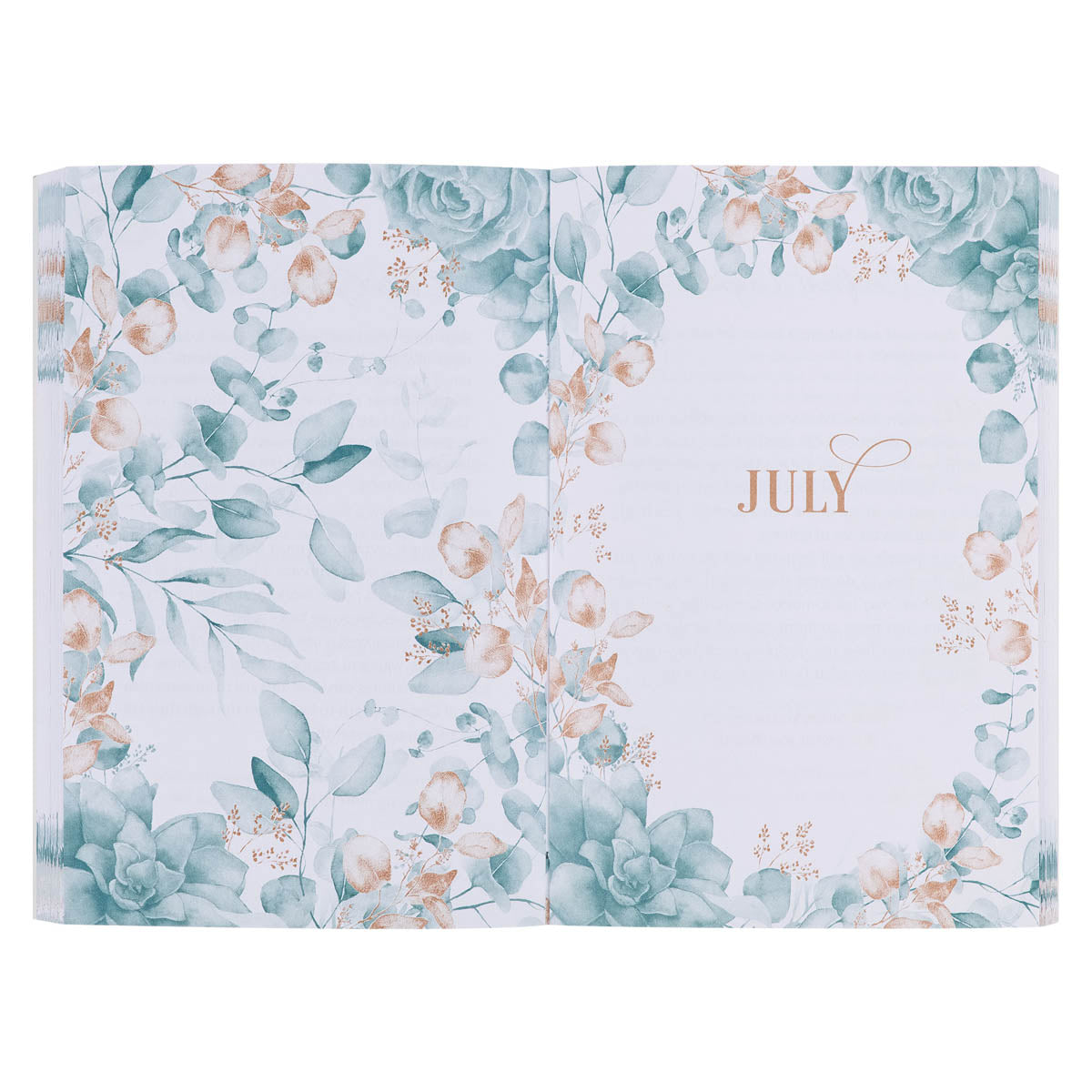 A beautiful wreath of greenery forms a frame around the gold-foiled sentiment on the front of the devotional.