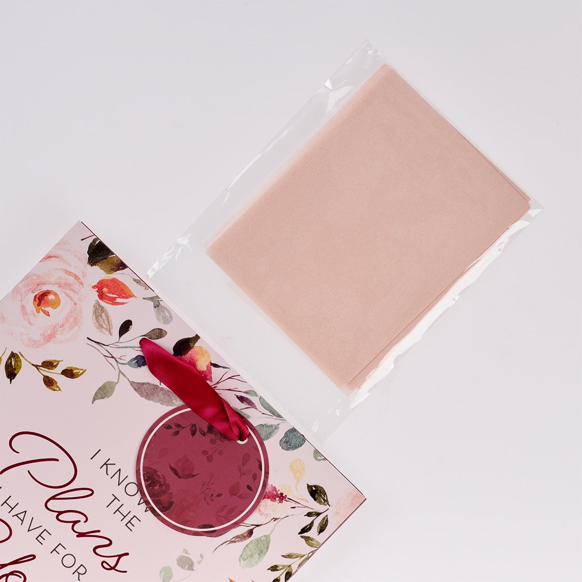 - Two sheets of pale pink tissue paper included