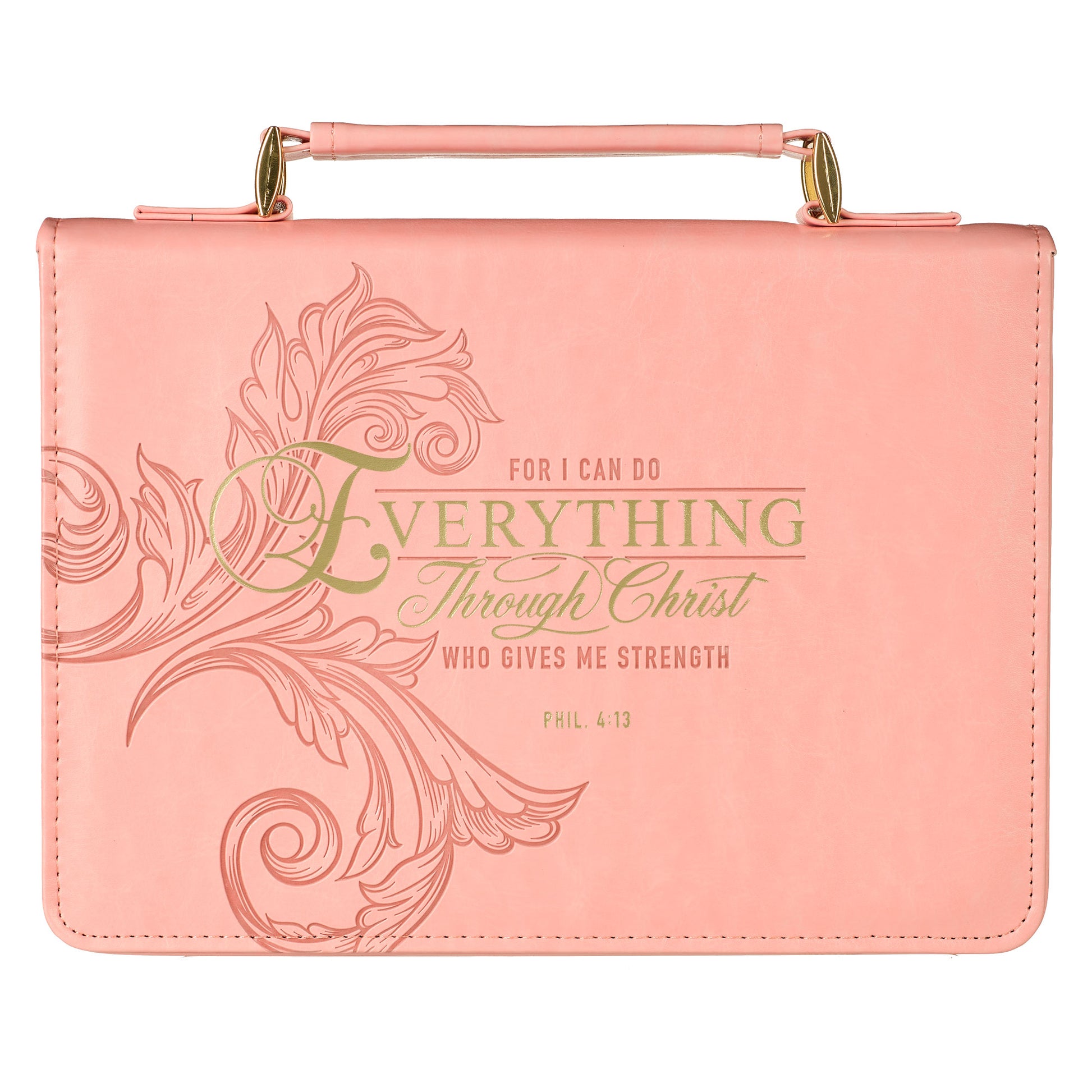 What better way to show your care for a struggling friend than to give her the Through Christ Fluted Iris Pink Faux Leather Fashion Bible Cover to protect her Bible and comfort her soul? Pair the Through Christ Fluted Iris Pink Faux Leather Fashion Bible Cover with other coordinating items to create the perfect, harmonized gift for a sister, aunt, or Sunday school teacher.