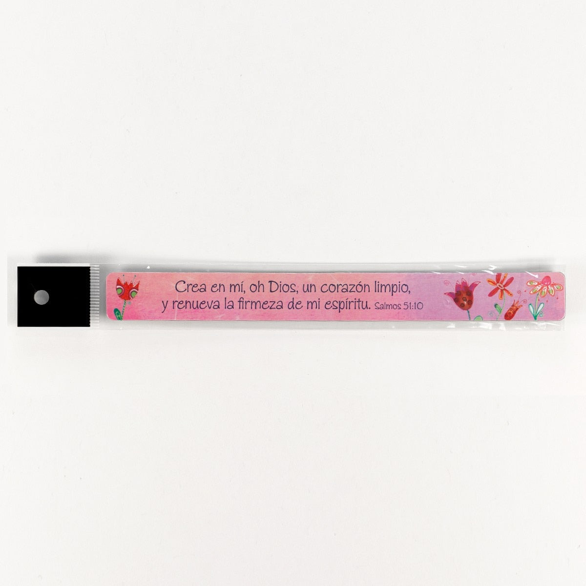 Estas tiras magnéticas de colores vivos llevan escrito un versículo de la Biblia acompañado de diseños y gráficos modernos y llamativos. Son perfectas para colocar en refrigeradores, casilleros, cubículos o en cualquier otra superficie magnética. Por su tamaño, son un medio ideal para llevar palabras de inspiración y ánimo a cualquier parte; se pueden mandar por correo en una carta y caben en cualquier espacio haciendo de estas tiras económicas y prácticas el regalo ideal. Esta tira de fondo rosado está adornada con motivos florales y lleva escrito el versículo de Salmos 51:10 «Crea en mí, oh Dios, un corazón limpio, y renueva la firmeza de mi espíritu».