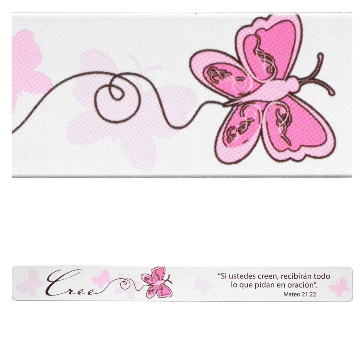 Las mariposas simbolizan un nuevo comienza y la Tira magnética «Cree» es un testimonio del nuevo comienzo que viene con la fe en Jesús. Una mariposa rosa vuela en el fondo de la Tira magnética «Cree» y deja un mensaje especial en su camino.
