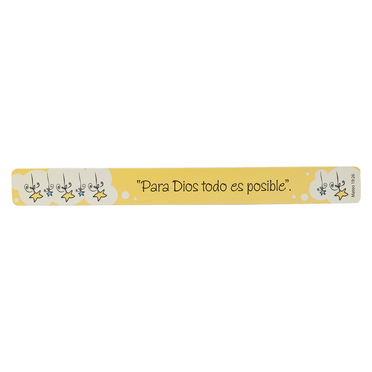 Estas tiras magnéticas de colores vivos llevan escrito un versículo de la Biblia acompañado de diseños y gráficos modernos y llamativos. Son perfectas para colocar en refrigeradores, casilleros, cubículos o en cualquier otra superficie magnética. Por su tamaño, son un medio ideal para llevar palabras de inspiración y ánimo a cualquier parte; se pueden mandar por correo en una carta y caben en cualquier espacio haciendo de estas tiras económicas y prácticas el regalo ideal. Esta tira de fondo amarillo está adornada con estrellas y lleva escrito el versículo de Mateo 19:26 «Para Dios todo es posible».