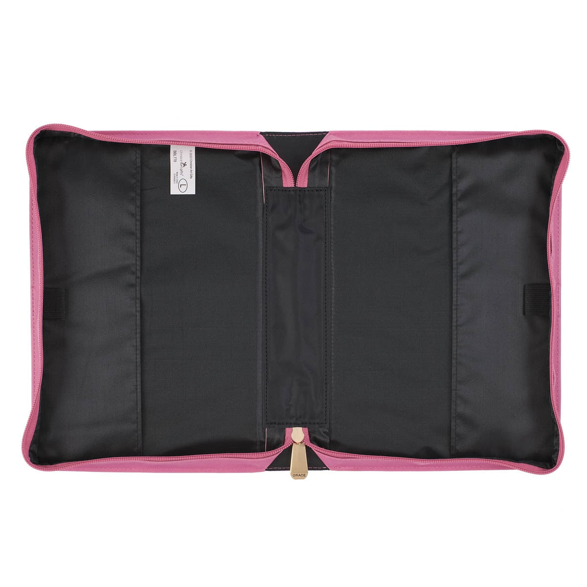 A lay-flat spine handle with gold-toned handle hardware lays completely flat when you open the case, and a gold zipper pull engraved with the word GRACE keeps any loose papers or bookmarks securely stowed inside the pages of your Bible when it is closed.