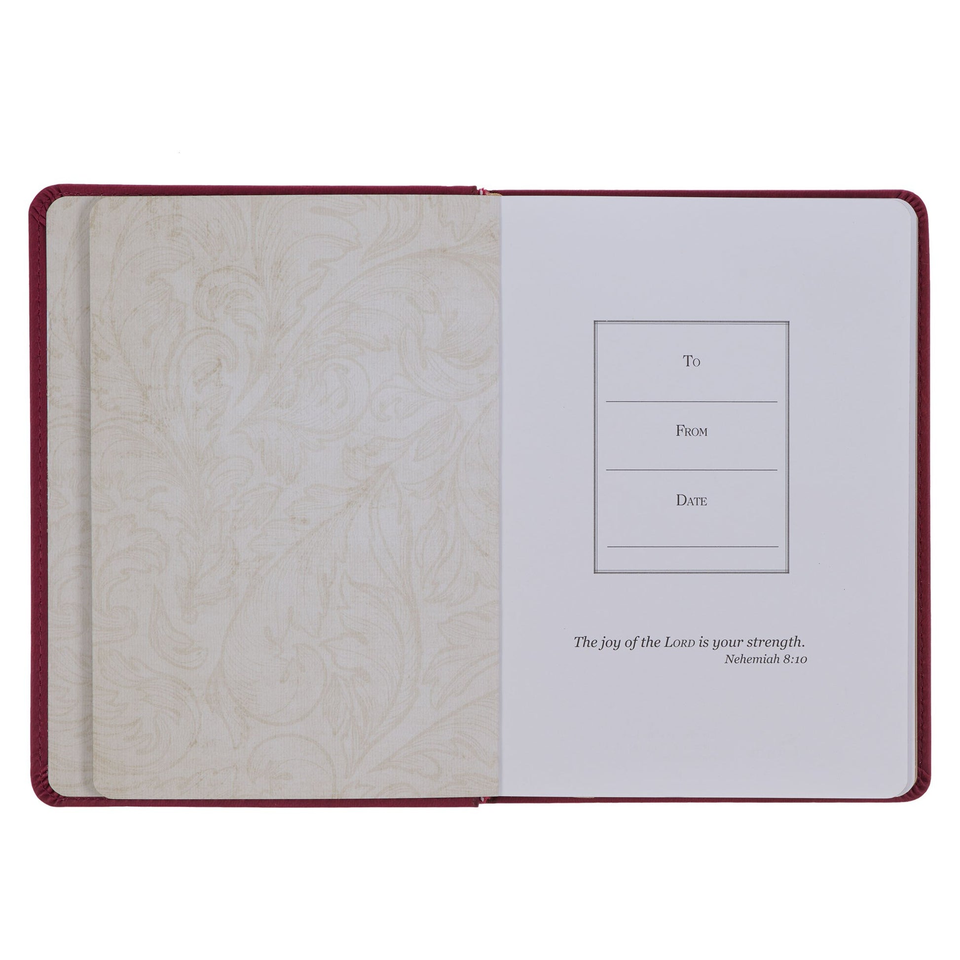 The rich burgundy faux leather journal is decorated with curling leaves outlined in glittering gold, heat-debossed curls, and flourishes. The sentiment is screen-printed in a small gold-foiled font and large, bold white lettering, and the Scripture reference is heat-debossed and set below it.