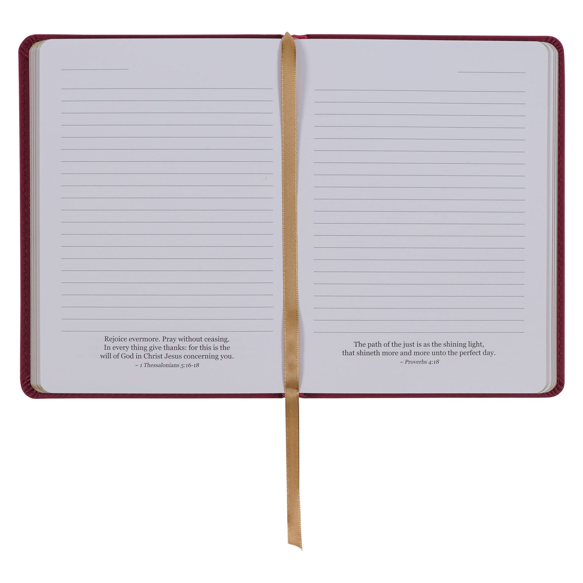 A presentation page in the front of the journal can be personalized when it is given as a gift. 240 lined interior pages each feature a Scripture verse that can be used as journal or prayer prompts. A handy burgundy satin ribbon marker is attached to the spine and can be used to mark a page.