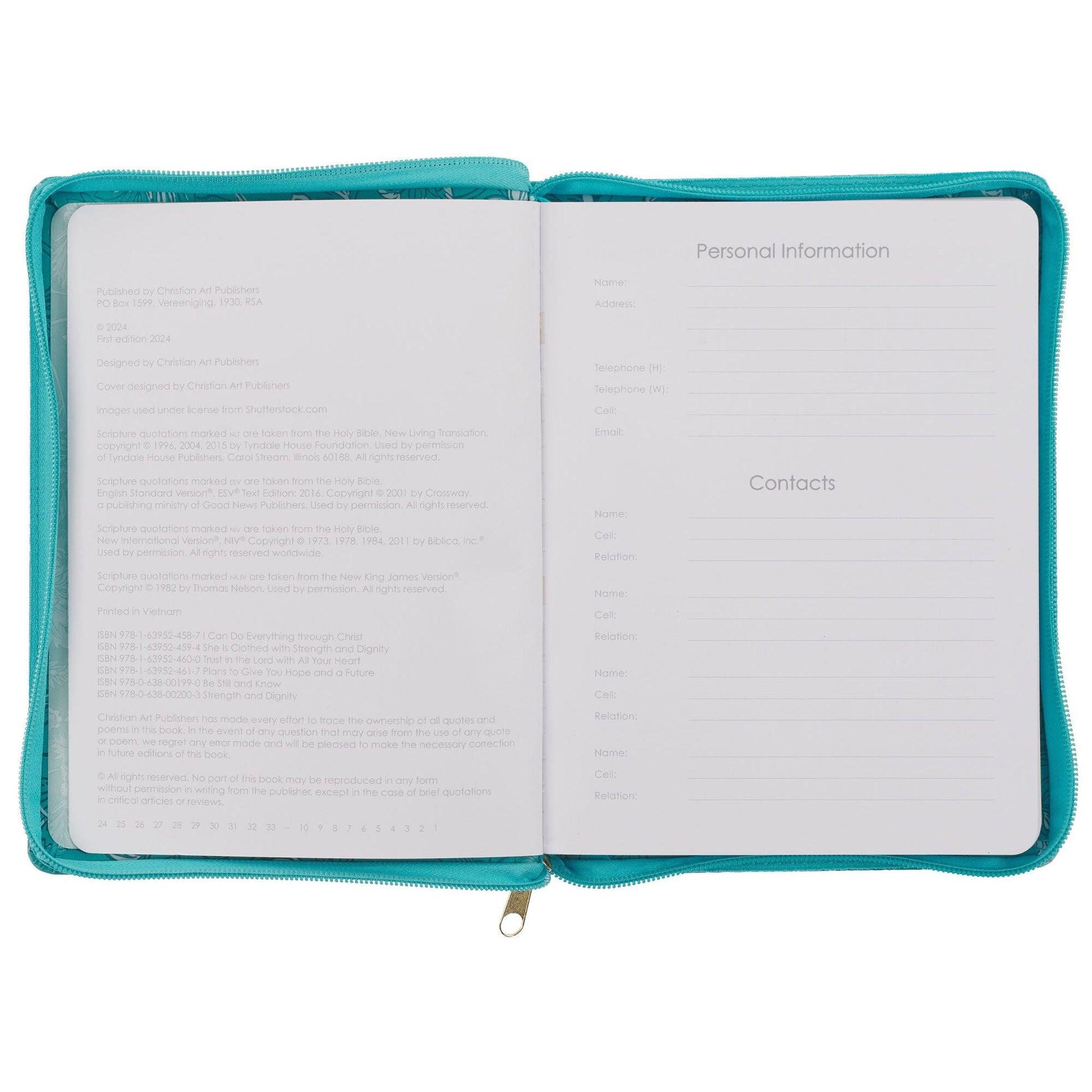 A matching teal zipper holds the covers together, and a gold zipper pull adds a pop of color. A satin ribbon marker is attached to the spine and will help to keep track of your progress. The interior pages are printed in two colors.