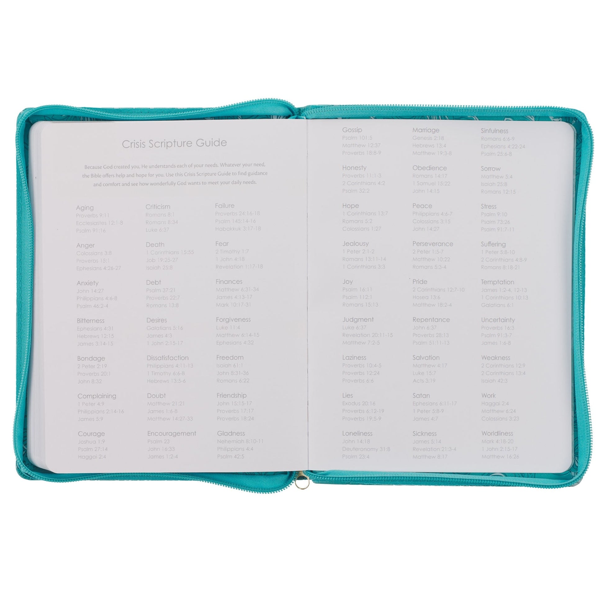 A crises Scripture guide in the back of the planner lists Bible verses according to the topic. It also includes space to record the names and addresses of friends and family.