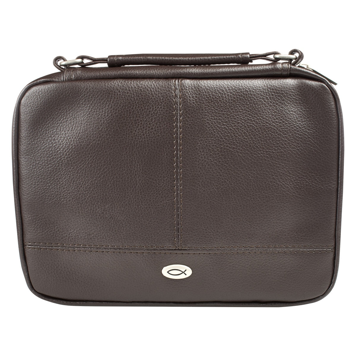 Bless the organized man or woman in your life with the Two-fold Dark Brown Faux Leather Organizer Bible Cover to help them study the Bible in an organized way.Double row topstitching divides the front cover of the dark brown faux leather cover into three sections. A silver oval badge, engraved with the classic Ichthus fish symbol, is placed in the center of the bottom panel and coordinated with the silver hardware that secures the brown faux leather handle.The two zippered compartments of the Bible case provide plenty of space for your Bible, a notebook, pens, paper, and more. The first compartment has a slip pocket to secure an included notepad on one side and another slip pocket for loose paper, three credit card holder slots, and 4 pen loops on the other side. The second compartment has two slide-in pockets to securely hold the covers of your Bible, a zipped mesh pocket (M, L, and EL only), and an additional pen loop that holds an included pen/highlighter combo. Both compartments close with zippers with two silver cross engraved zipper pulls. This Bible cover is available in six sizes: extra-small, small, thinline small, medium, large, and extra-large.