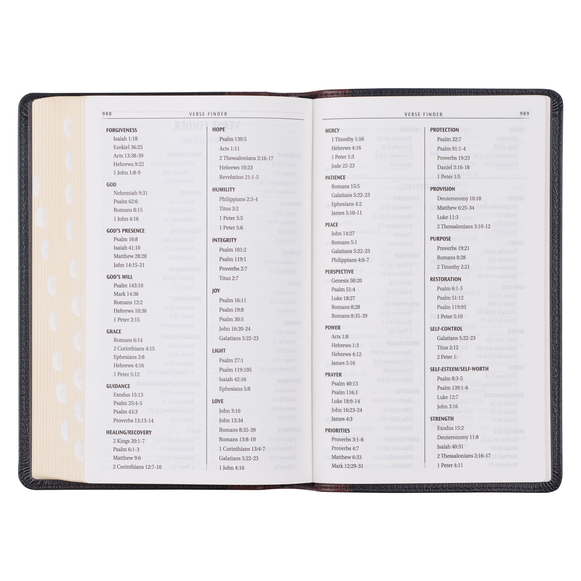 The classic design of the Two-tone Brown and Black Full Grain Leather King James Version Deluxe Gift Bible gives a nod to the deep tradition and style of classic King James Bibles of old.