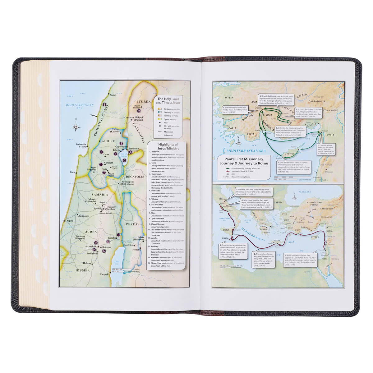 The deluxe gift Bible is printed in a standard 9-point type and the text is arranged in a double-column format and features reader-friendly subheadings. Thumb index tabs assist in finding the right book of the Bible, and a thematic Scripture verse finder assists in finding the right verse. The words of Christ are printed in red for clear distinction. 8 full-color maps are included for reference. A one-year Bible reading plan is included to keep your personal reading on track. The front of the gift Bible features a presentation page to complete with a special encouraging message.