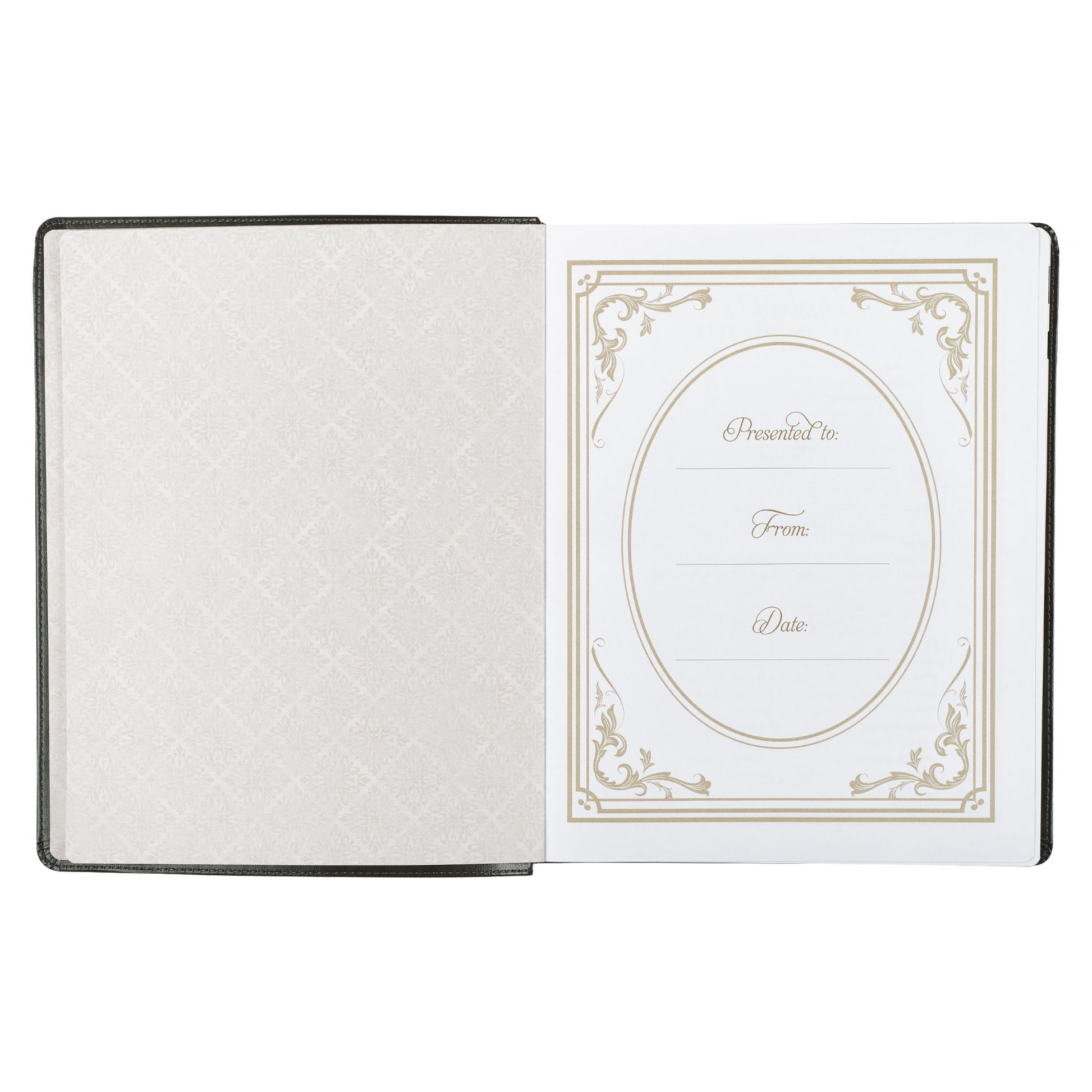 Beautiful gilded page designs frame the special pages of this Bible. These pages include a presentation page, family trees of both the husband and wife, a birth and death register, and a log for special occasions and marriages. A beautiful family blessing from Romans is also included. To keep you on track, the Bible includes a one-year Bible reading plan in the back.