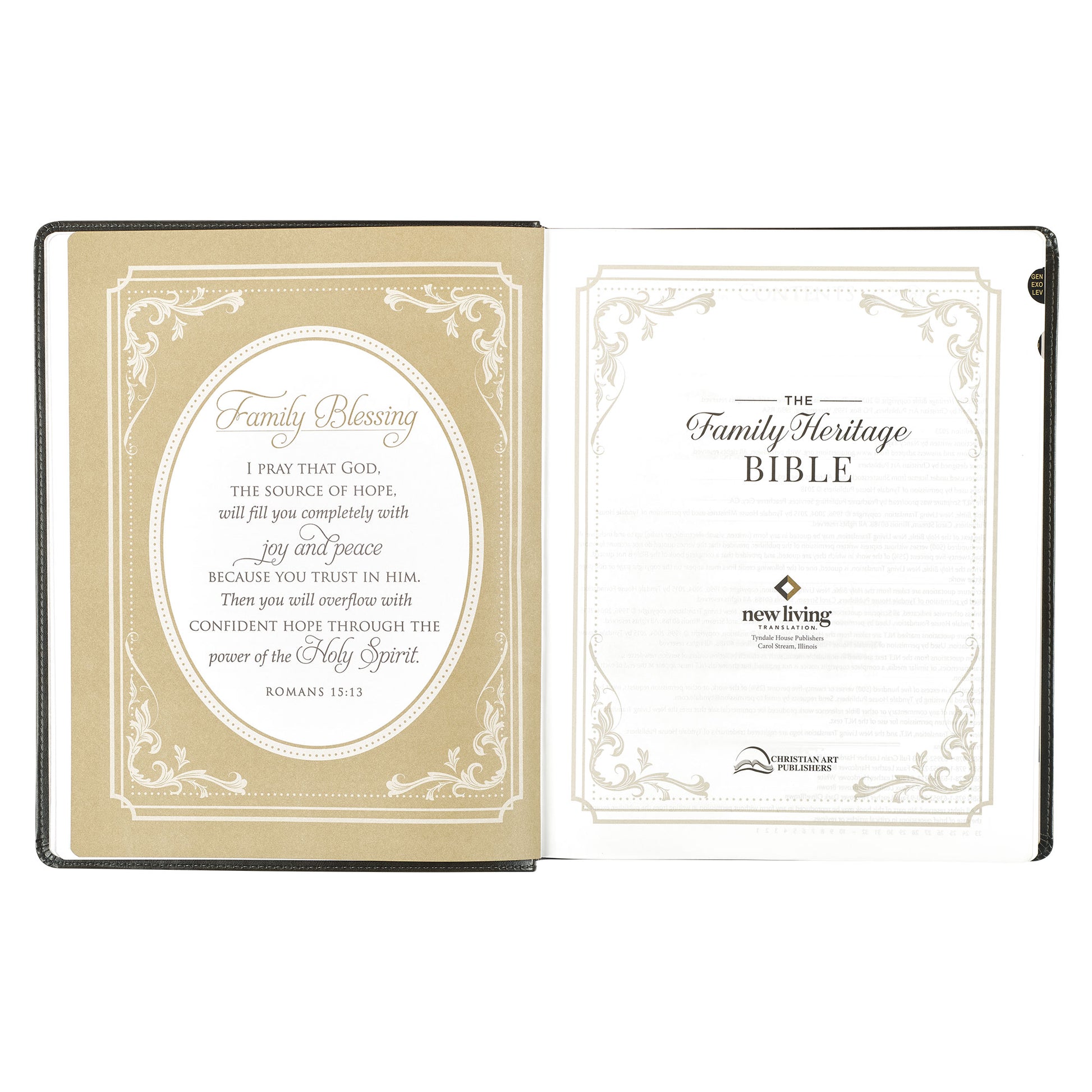 Inside, the beautifully decorated brown and gold pages create an heirloom feel. The Bible features the complete text of the New Living Translation® in a generous 12.5-point font size and single-column layout, with an introduction to the translation and the team behind it.
