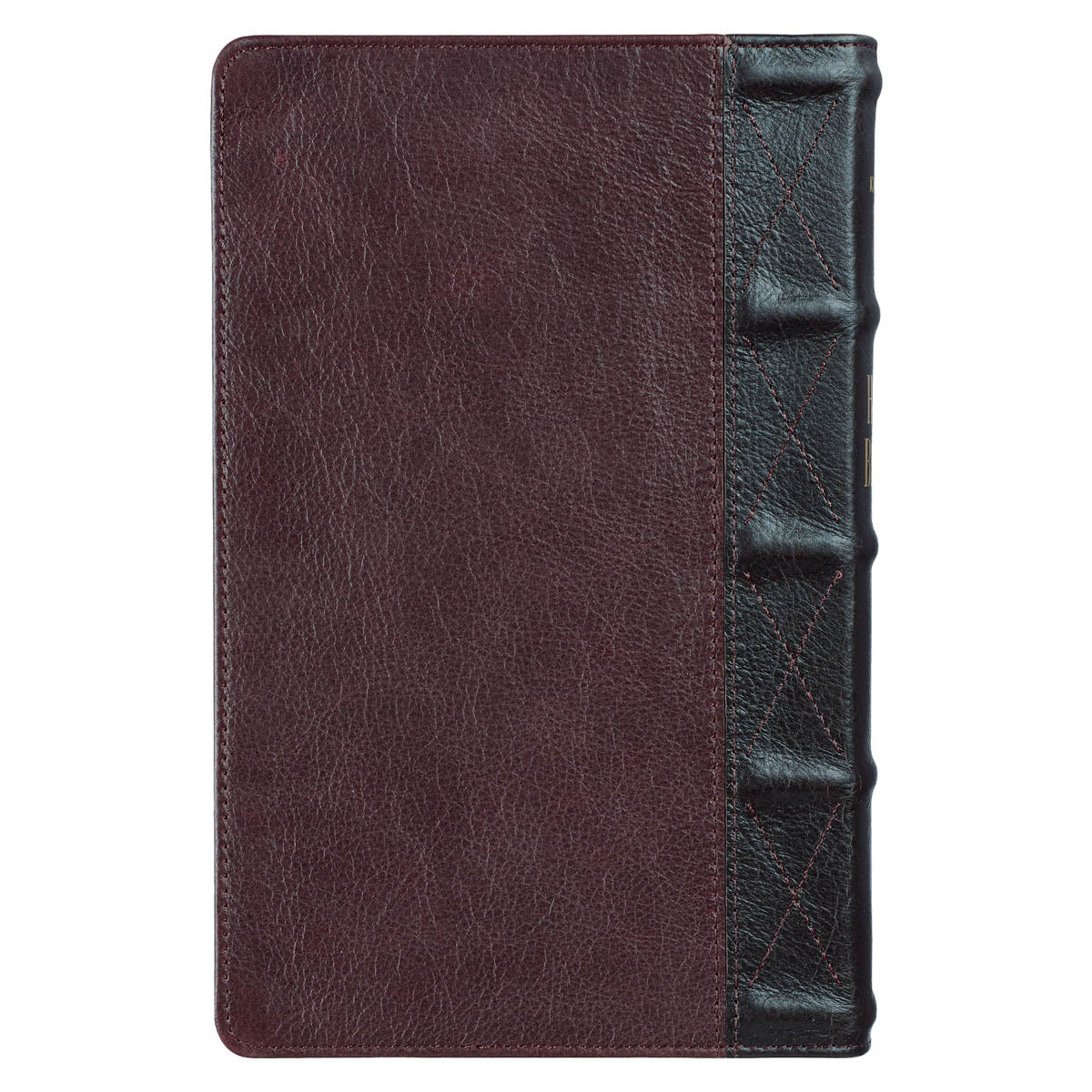 A double row of topstitching connects a rich chocolate brown-colored spine to medium brown front and back covers. Additional topstitching runs along the KJV Bible's edges for reinforcement. The wrap-around spine is secured with eight cross-shaped topstitched designs. The gold foiled and heat debossed title and version reference and five decorative spine ribs appear on the spine.