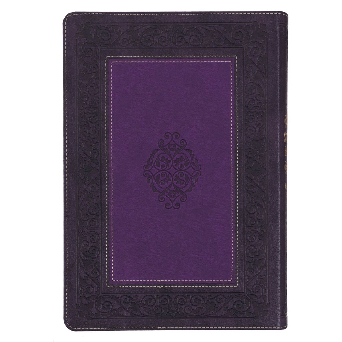 This beautifully designed Bible features a smooth, light purple patch inlay that is tastefully framed by a darker purple faux leather that covers the spine and back cover. A meticulously heat-debossed fluted ivy border encases the inlaid patch and is embellished with a gold-foiled title that is accented by two heat-debossed sophisticated French ivy designs.