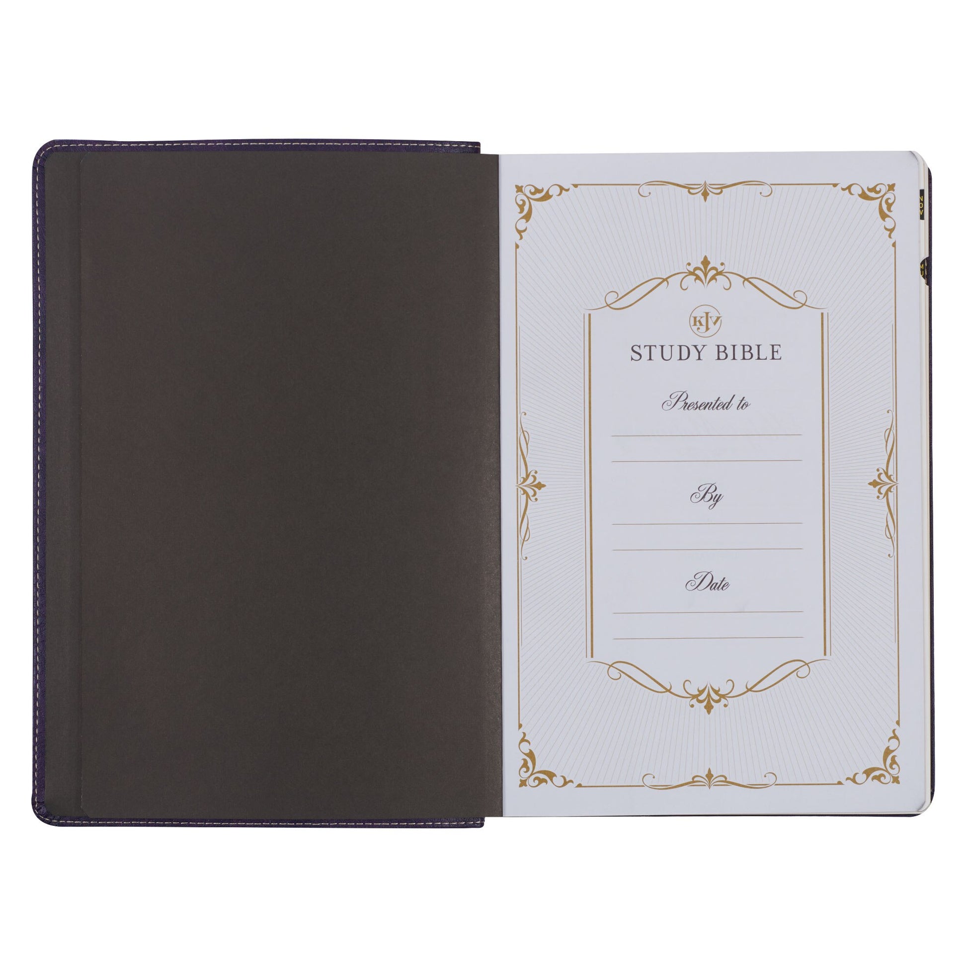 The Two-tone Purple Faux Leather Large Print King James Version Study Bible with Thumb Index, with its exceptional design, is the perfect study companion for the fashion-conscious woman in your life.