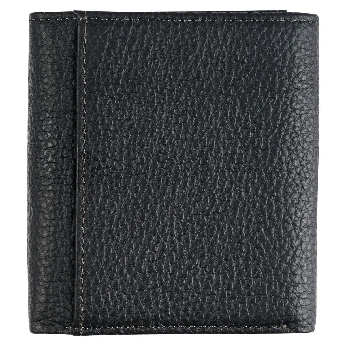 The two-section trifold men's wallet is topstitched along the edges for durability and features 6 credit card slots, 3 multi-purpose slip pockets, and a zippered coin pouch. An additional slip pocket can be found on the exterior back panel.