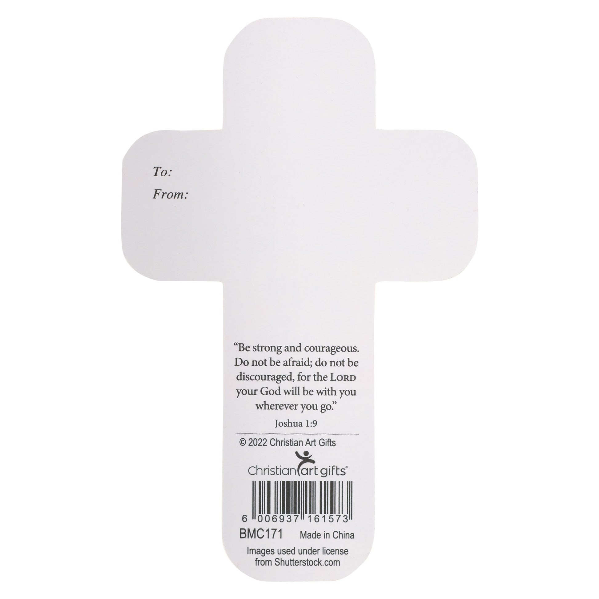 A colorful panorama of blue mountains topped by a radiant multicolor sunset decorates the front of this cross-shaped bookmark. The sentiment is printed in blue and partially outlined in gold foil.