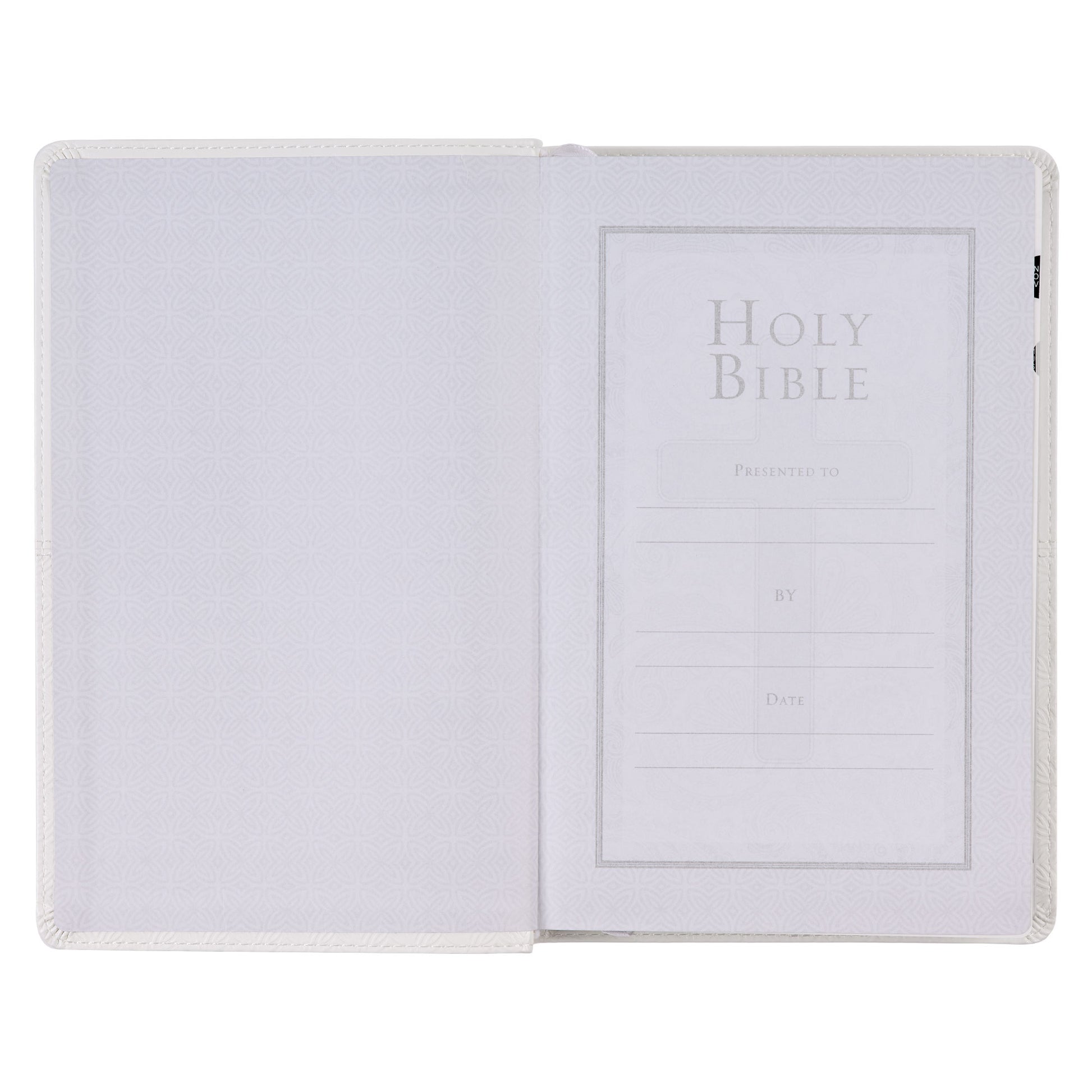 The pure White Faux Leather King James Version Deluxe Gift Bible with Thumb Index is the perfect Bible for a White Bible Ceremony. This traditional Southern ceremony takes place a week or so before the wedding. During the intimate ceremony, the bride is given a white Bible and several flowers that each represent a quality found in Christian marriage. With its traditional text, the white faux leather King James Version Bible is the perfect addition to this age-old ceremony.